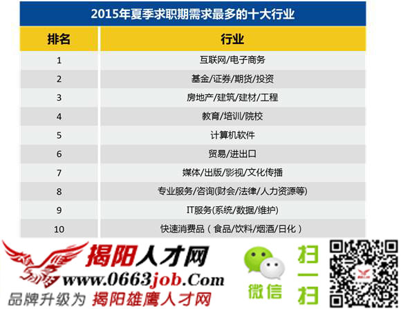 圖為2015年夏季求職需求最多的十大行業(yè),換句話講就是這些行業(yè)的發(fā)展勢(shì)頭較猛,屬于朝陽行業(yè),需要更多優(yōu)秀人才。相信大部分人都希望可以進(jìn)入一個(gè)朝陽的行業(yè),在風(fēng)口行業(yè)工作比在夕陽行業(yè)中努力更容易獲得成功。