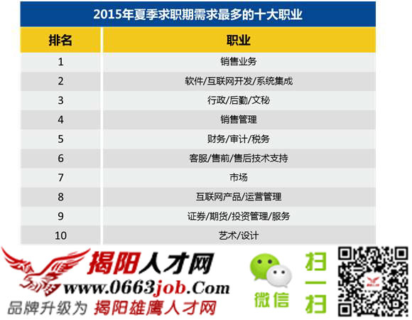圖為2015年夏季求職期需求最多的十大職業(yè),也就是目前比較稀缺人才的行業(yè),有些職業(yè)是企業(yè)之中不可或缺的職位,有些職位則是由于行業(yè)的蓬勃發(fā)展而不斷增加的職位??傊?,這些職位決定你未來做什么,選擇時(shí)一定要慎之又慎。